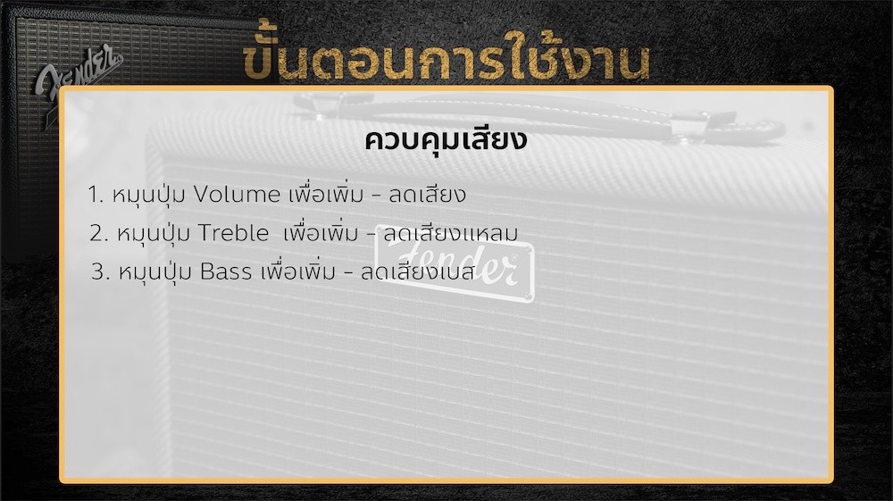 Fender Monterey tweed สินค้าน้องใหม่ สุดคลาสสิค ยังคงเดิมกับรูปแบบของ Fender ที่สุดแสนจะคลาสสิก ให้อารมณ์เหมือนกับย้อนยุคไปอยู่ในยุค 90 เลยทีเดียว แม้ว่าจะเป็นสินค้าน้องใหม่ แต่ศักยภาพนี่ถึงกับเป็นพี่ใหญ่เลยทีเดียว ไม่ว่าจะเป็นศักยภาพเสียงที่เพิ่มขึ้น และมีการปรับเบส ปรับเสียงร้อง เพิ่มขึ้นได้ถึง 12 ระดับเลยทีเดียว พร้อมการตกแต่งและสีสันใหม่ ห่อหุ้มด้วยวัสดุอย่างดี เพิ่มความเท่ไม่เหมือนใคร